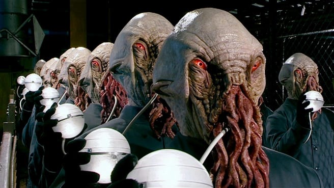 The new show’s first proper base under siege. (Dalek is close, I guess, but having one monster with a personality rather than a horde makes it feel like something different.) The Doctor says, “Oh, it’s a sanctuary base!” in the same tone you might say, “Oh, it’s a Norman castle!” which is nice.
