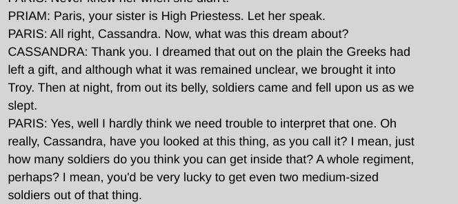 And this is even better. Quite neat that it only introduces the Trojans in episode 2, so we’re not overloaded. The reaction to Cassandra describing her dream is hilarious.